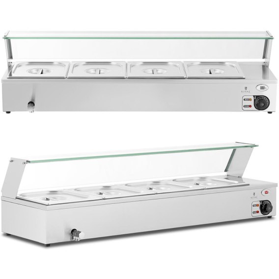 Bemar gastronomiczny marki Royal Catering sprawdzi się w restauracjach, bufetach, na stołówkach czy w barach do utrzymywania w cieple żywności. Urządzenie posiada moc 2000 W. Regulacja temperatury następuje w zakresie 30-110°C. Bemar działa na zasadzie konwekcji, element grzewczy podgrzewa wodę znajdującą się pomiędzy urządzeniem a pojemnikami GN i przekazuje ciepło do pojemników, bez ryzyka przypalenia. Duża pojemność 4 x GN 1/2 (4 x 4,7 l) pozwala na podgrzanie kilku różnych dań w jednym czasie. W urządzeniu można zastosować inne rozmiary pojemników GN i je połączyć ze sobą. Bemar wykonany został ze stali nierdzewnej, jest wytrzymały, odporny na korozję i higieniczny. Kranik spustowy ułatwia opróżnianie i czyszczenie urządzenia. Osłona z hartowanego szkła chroni żywność przed zabrudzeniem. Gumowe nóżki zapewniają stabilność i nie rysują podłoża.