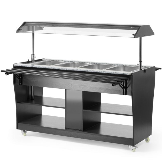 Kod producenta: 274064 Bufet grzewczy marki Arktic sprawdzi się w restauracjach samoobsługowych czy w cateringu. Wyposażony został w oświetlenia daszku, posiada składane prowadnice na tace po obu stronach. Daszek można opuścić, aby pełnił funkcję osłony. Bufet przeznaczono na 4 pojemniki GN 1/1 o maksymalnej głębokości 150 mm. Z boku znajdują się półki do przechowywania talerzy i sztućców. Obudowa wykonana została ze stali nierdzewnej z czarną drewnianą sklejką. Temperatura jest regulowana w zakresie 30-90deg;C. Cechy produktu: