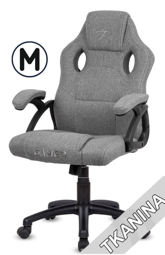 Fotel obrotowy do biurka, biura, dla gracza model CARRERA rozmiar M, tapicerowany w całości szarą tkaniną, marki Lugano. Ergonomicznie wyprofilowane oparcie.