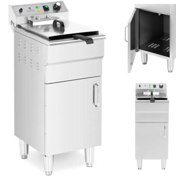 Frytownica marki Royal Catering sprawdzi się w branży HoReCa, umożliwia przyrządzenie szerokiej gamy potraw takich jak frytki, kurczaka, paluszki z mozzarelli, cebulowe krążki, rybę, a nawet pączki. Optymalna pojemność urządzenia wynosi 13 l. Duża moc 5000 W sprawia, że przygotowanie dań i dodatków przebiega bardzo szybko. Dzięki termostatowi (60-200°C) można ustawić temperaturę idealną dla każdego z produktów. Ergonomiczna konstrukcja wpływa na wygodę użytkowania. Zimna strefa zapobiega przypalaniu się resztek, co wydłuża żywotność oleju i nie psuje smaku dań. Kurek spustowy umożliwia z kolei łatwe zlanie frytury. Funkcjonalna szafka pod frytownicą nadaje się z powodzeniem do przechowywania naczyń, przyborów kuchennych lub przypraw. Podobnie jak frytownica została wykonana z solidnej i trwałej stali nierdzewnej.