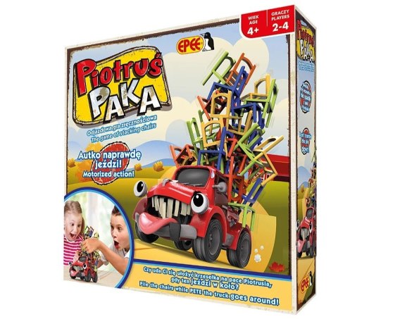 Piotruś Paka to zabawne autko, które chętnie przewiezie Twoje krzesła. Ale uwaga! Musisz je wkładać na jego pakę bardzo ostrożnie: Piotruś nie ma czasu się zatrzymywać, jest w ciągłym ruchu! Jeśli konstrukcja zawali się, przegrasz! To wspaniały trening zręczności dla małych i dużych!