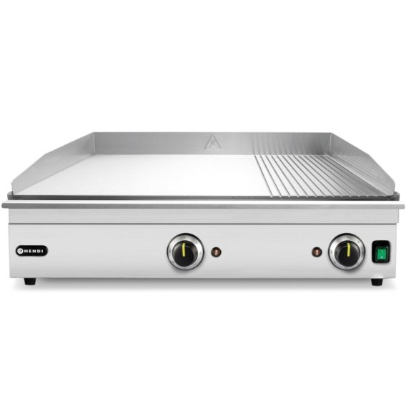 Płyta grillowa w ⅓ żebrowana firmy HENDI wyróżnia się wykonaniem z hartowanej stali nierdzewnej i możliwością osiągnięcia temperatury aż do 300°C, co sprawia, że jest idealna do przygotowywania tłustych mięs, na przykład burgerów i kiełbasek. Równocześnie, gładka strona grilla idealnie sprawdzi się również do przyrządzania jajek lub pankejków. Połączenie rantu tylnego i wyjmowanej szuflady na tłuszcz sprawia, że urządzenie łatwo utrzymać w czystości. Płyta o wymiarach 688×410 mm została wykonana z blachy o grubości 8 mm, która doskonale rozprowadza i utrzymuje ciepło oraz może być bezpiecznie czyszczona przeznaczonymi do tego narzędziami (skrobaczki, szczotki). Grill posiada dwie oddzielnie regulowane strefy grzewcze o mocy 1750 W oraz strefę pozbawioną grzałki, która wykorzystuje ciepło odpadowe.