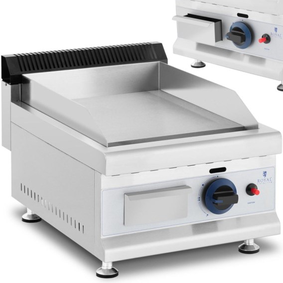 Grill gazowy marki Royal Catering sprawdzi się jako wyposażenie każdej profesjonalnej kuchni. Idealny do smażenia dużej ilości kotletów, burgerów, jajek, kiełbas, bekonu itp. Duża moc 3100 W pozwala szybko i sprawnie przygotować potrawy. Urządzenie posiada gładką powierzchnię grillową o wymiarach 35 x 40 cm. Wokół płyty zastosowano rant chroniący otoczenie przed zachlapaniem. Tacka ociekowa zbiera ściekający tłuszcz ułatwiając czyszczenie urządzenia. Grill zasilany jest gazem ziemnym. Urządzenie wykonane zostało ze stali nierdzewnej, odznacza się trwałością i wydajnością. Nie reaguje w kontakcie z żywnością, jest łatwy w czyszczeniu i posiada atrakcyjny wygląd.
