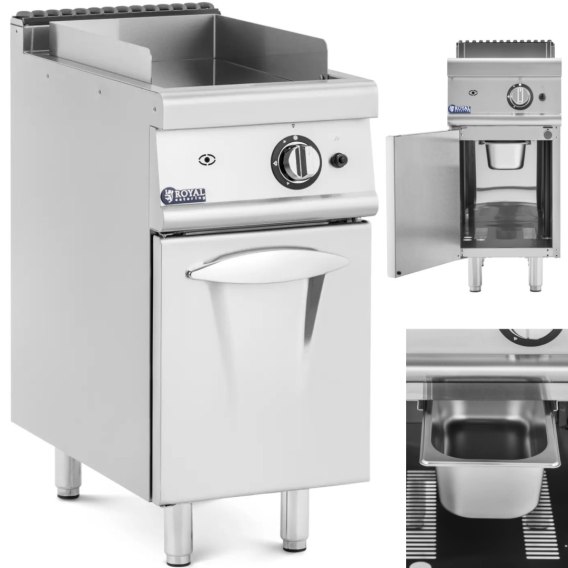 Gazowy grill marki Royal Catering to solidny model z płytą grillową z chromowanej stali. Jest idealny dla branży gastronomicznej, czy to w hotelach, kawiarniach, food truckach, bistrach, barach, restauracjach czy na wszelkiego rodzaju imprezach cateringowych. Pod gładką powierzchnią do smażenia znajduje się pojemna szafka na garnki, patelnie i inne przybory kuchenne, które będą chronione przed kurzem. Otwiera się ją za pomocą drzwi na zawiasach i szybko można sięgnąć po jej zawartość. Na dużej powierzchni grilla można szybko przygotować mnóstwo kanapek, hamburgerów, tostów francuskich, tortilli i innych przysmaków. Gazowa płyta grillowa osiąga temperaturę od 50 do 300°C. Poziom grzania ustawia się za pomocą pokrętła. Urządzenie włącza się za pomocą zapłonu piezoelektrycznego. Ponadto model posiada też płomień zapalający. Urządzenie jest fabrycznie ustawione na gaz typu I3B/P(50), który idealnie sprawdzi się w wielu kuchniach gastronomicznych. W zakresie dostawy znajdują się dwa komplety dysz do konwersji płyty grillowej na gaz ziemny lub LPG. Nóżki o regulowanej wysokości zapewnią stabilną pozycję nawet na nierównym podłożu. Blokada płomienia, zaokrąglone krawędzie, zintegrowany okap i osłona przeciwbryzgowa zadbają o bezpieczeństwo podczas użytkowania. Obudowa i drzwi szafki wykonane są z wysokiej jakości stali nierdzewnej. Materiał jest nie tylko wytrzymały, ale także wyjątkowo higieniczny - idealny do codziennego użytku w profesjonalnych kuchniach. Gładkie powierzchnie są odporne na większość zabrudzeń i łatwo je wyczyścić. Można też wyjąć tacę ociekową, aby dokładniej umyć ją z tłuszczu.