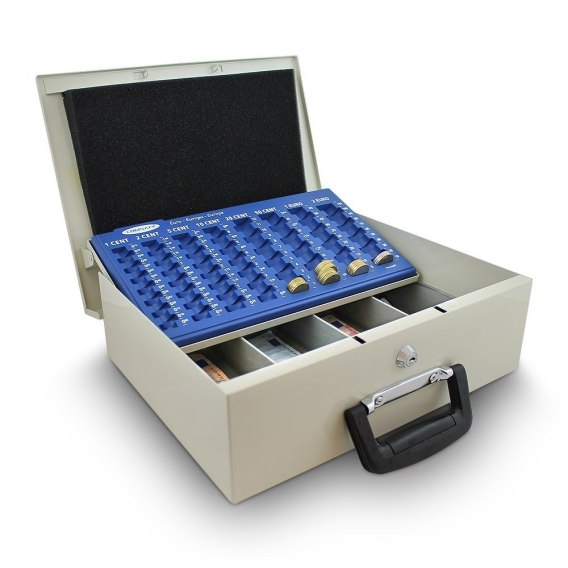 - 4 przedziałki na banknoty - Wyjmowana tacka namonety - Wkładkaz piankiw pokrywiedo mocowania monetyw czasie transportu - praktyczny uchwyt do transportu - Dwa klucze w zestawie