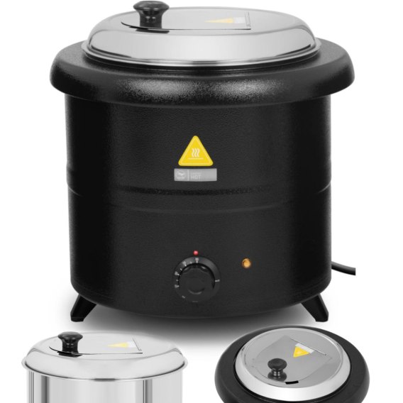 Kociołek do zupy marki Royal Catering sprawdzi się w restauracjach, bufetach, firmach cateringowych. Doskonale utrzymuje ciepło dań takich jak zupy gulasze czy sosy. Duża moc 600 W zapewnia szybkie podgrzewanie potraw. Temperatura regulowana jest pokrętłem w zakresie 30-80°C. Dzięki zastosowaniu zjawiska konwekcji zmniejszone zostało ryzyko przypaleń. Element grzewczy podgrzewa wodę, która znajduje się między zbiornikiem a obudową. Wewnętrzny pojemnik ze stali nierdzewnej jest wyjmowany. Antypoślizgowe nóżki zapewniają stabilność kociołka. Pokrywka została zamocowana na zawiasie, posiada otwór na chochlę oraz nienagrzewający się uchwyt.