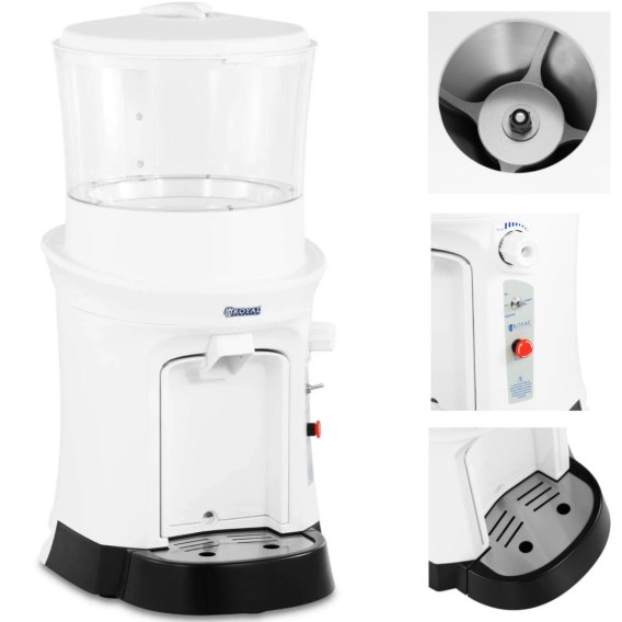 Kruszarka do lodu marki Royal Catering jest niezbędna w barach, kawiarniach lub restauracjach, które oferują różnego rodzaje napoje tworzone na bazie lodu. Urządzenie idealnie nadaje się do ciągłego użytkowania. Wszystkie wrażliwe elementy kruszarki zostały wykonane z wysokiej jakości stali nierdzewnej, natomiast obudowa, wylewka i pokrywa zostały wykonane z wytrzymałego tworzywa sztucznego. Dzięki mocy400 W urządzenie działa z prędkością do 320 obr./min, a ostrze ze stali nierdzewnej niezawodnie kruszy duże ilości kostek lodu, które wkłada się do pojemnika o pojemności 12 l, również wykonanego ze stali nierdzewnej. Gotowy pokruszony lód szybko wypada przed duży dziobek. Bezpieczeństwo użytkowania zapewnia system automatycznego wyłączania w chwili otwarcia pokrywy, dzięki czemu pokaleczenie się podczas wytwarzania lodu jest zniwelowane. Dodatkowo antypoślizgowe gumowe nóżki zapewniają bezpieczną podstawę i zapobiegają zarysowaniu powierzchni przy intensywnym użytkowaniu.