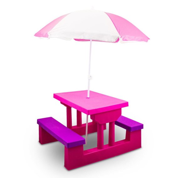 Zestaw mebli ogrodowych dla dzieci to wspaniały pomysł podczas robienia imprezy plenerowej, każdy maluch znajdzie miejsce dla siebie, ale również podczas odpoczynku, czy prac ogrodowych.Ławki mogą pomieścić 4 osoby tak, aby każdy miał miejsce dla siebie. Mebel jest trwały i stabilny, a parasol wykonany z poliestru szybko otwiera się i zamyka, ale przede wszystkim zapewnia cień i może być mocno wbity w ziemię. Ławki do siedzenia są z polipropylenu, co sprawia że są miękkie i wygodne. Ławka ze stolikiem może być użytkowana zarówno w domu jak i w ogrodzie.