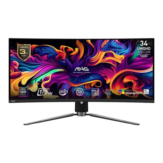 Informacje dodatkowe: Krzywizna ekranu: 1800R, HDMI 2.1, DP 1.4a, 1x USB Type-C z trybem DP oraz ładowaniem 15W, Konstruckja bezramkowa, Funkcja PIP / PIB, Jasność matrycy:, - SDR: 250 nitów, - HDR: 1000 nitów, Synchronizacja adaptacyjna, Delta E <= 2, Aplikacja Gaming Intelligence, MSI OLED Care 2.0