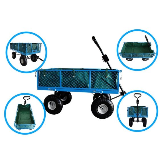 Stalowy wózek ogrodowy sprawdzi się w każdym ogrodzie i podczas rodzinnych wypadów w plenerze. Duża pojemność metalowego kosza pomieści sprzęt plażowy, zabawki. Wózek jest niezastąpiony w ogrodzie, posiada wyjmowaną łatwą w czyszczeniu plandekę. W wózku możesz przewozić ziemię do kwiatów, nawozy i rośliny. Kosz wózka jest składany dzięki czemu tworzy platformę idealna do przewozu przedmiotów o większym gabarycie.