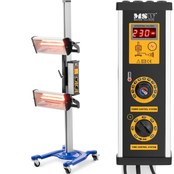 Promiennik podczerwieni marki MSW sprawdzi się w warsztatach samochodowych, lakierniach i wszędzie tam, gdzie potrzebne jest szybkie wysychanie farb, lakierów, żywic czy różnego typu wypełniaczy. Lampa posiada moc 2 x 1000 W. Urządzenie suszy farby i lakiery skuteczniej niż konwencjonalne sprzęty, ponieważ promieniowanie wnika do wnętrza i pozbawia je wilgoci od środka. Zapobiega tym samym tworzeniu się pęcherzy oraz przyspiesza proces. Promienie podczerwone nie wydzielają ciepła do otaczającego powietrza a przenoszą je bezpośrednio na powierzchnię roboczą. Hydrauliczne ramię przesuwa się w pionie i poziomie na wysokość do maks. 160 cm. Emitery można włączać i wyłączać indywidualnie. Kąt padania promieni można regulować w zależności od wymagań obrabianego przedmiotu. Obszar jednocześnie naświetlamy ma wymiary 800 x 800 mm. Czas suszenia ustawiany jest cyfrowo w zakresie0 - 60 min, można też wybrać lampy, które mają być użyte do suszenia. Temperatura zależna jest od odległości do obrabianego przedmiotu i może się wahać w zakresie 30 - 100°C. Metalowa kratka chroni przed uszkodzeniem oraz oparzeniem. Konstrukcja lampy wykonana została z wytrzymałej stali, koła z hamulcami zapewniają mobilność i stabilizację.