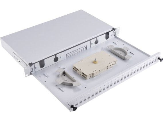 Panel światłowodowy z wysuwalną tacką do montażu w szafach i stojakach 19", 24 porty SC simplex, kolor szary.