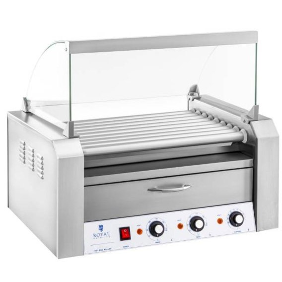 Roller grill rolkowy z osłoną i szufladą grzewczą do bułek 16 parówek HotDog 2200W 230V Royal Catering
