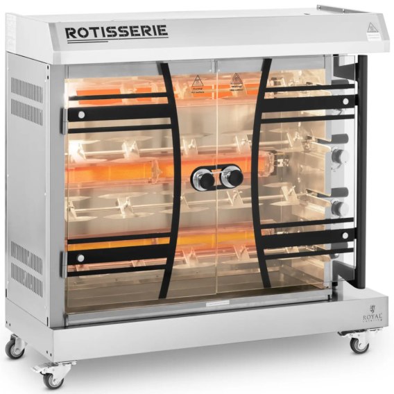 Gazowy rożen do kurczaków marki Royal Catering pozwala zaoferować klientom pyszne kurczaki, rostbefy, porchetty, pieczenie i wiele innych świeżo przygotowanych i chrupiących przysmaków. Na czterech obracających się szpikulcach, z których każdy mieści 4 kurczaki, można upiec ulubione specjały, równomiernie, delikatnie i z chrupiącą skórką. Każdą grzałkę można włączać i wyłączać, co pozwala przygotować różne potrawy w tym samym czasie. Urządzenie ma całkowitą moc 3 x 5,5 kW, więc działa szczególnie wydajnie i niezawodnie. Żaroodporne drzwi ze szkła hartowanego zapewniają doskonały widok na jedzenie przez cały czas grillowania. Oświetlenie wnętrza pozwala również zaprezentować przysmaki w najlepszym świetle. Obudowa ze stali nierdzewnej dopełnia profesjonalnego wrażenia. Materiał ten nie pochłania smaku ani zapachów, jest szczególnie wytrzymały i bardzo łatwy w czyszczeniu. Cztery koła pozwalają łatwo ustawić opiekacz w dowolnym miejscu. Solidna konstrukcja i dwa hamulce postojowe gwarantują mu stabilność.