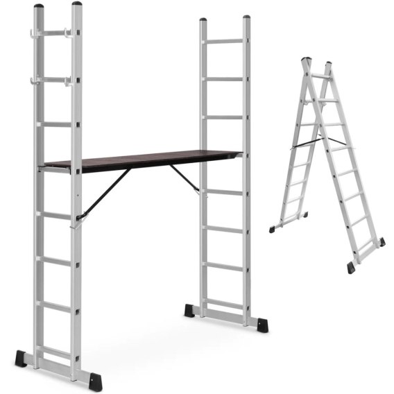 - Rusztowanie aluminiowe można wykorzystać na 3 sposoby: jako drabinę przystawną o wysokości do 3,8 m, drabinę wolnostojącą i rusztowanie robocze,