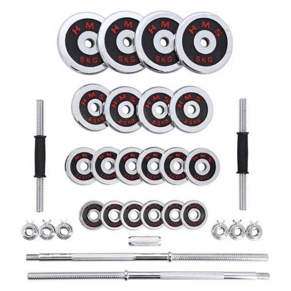W skład zestawu wchodzą dwa krótkie gryfy, długi skręcany gryf, sześć zacisków i łącznie 20 talerzy obciążeniowych. Całość znajduje się w wygodnej walizce. Łączna waga zestawu to 50 kg, dlatego dla łatwiejszego transportu, walizka posiada kółka, co pomaga w przemieszczaniu się ze sprzętem.