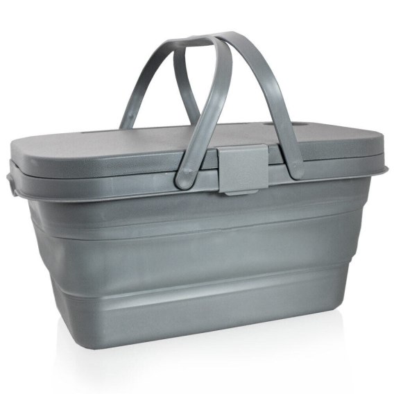 Składany koszyk jest idealnym towarzyszem na grilla, piknik, czy pod namiot, a także na zakupy. Można go złożyć, aby zaoszczędzić miejsca w aucie lub domu podczas przechowywania. Ważący zaledwie 1,3kg jest lekki, ale też bardzo stabilny. Pojemność kosza to 16L więc jest wystarczający na to, aby pomieścić średnie zakupy oraz zapakować wszystkie potrzebne produkty na ognisko. Pokrywę koszyka można wykorzystać jako stolik, wystarczy jedynie rozłożyć nóżki, sprawdzi się dobrze również jako podpora pod laptopa. Na stoliku znajduje się uchwyt na napój, a także uchwyt na telefon lub tablet.