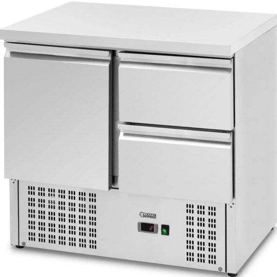 Stół marki Royal Catering zapewnia świeże składniki do szybkiego przyrządzenia różnorodnych potraw. Sprawdzi się w restauracjach, kawiarniach, barach szybkiej obsługi i hotelach. Będzie też nieocenioną pomocą w pizzeriach, barach sałatkowych oraz punktach z kebabami i falafelami. Blat roboczy ma wymiary 90 x 70 cm. Zakres chłodzenia wynosi od 2 do 10°C. Temperatura ustawiana jest za pomocą łatwego w obsłudze cyfrowego panelu sterowania. Automatyczny termostat dba o utrzymanie wybranego poziomu. Urządzenie szybko osiąga żądaną temperaturę za sprawą kompresora o mocy 235 W. Stół posiada również funkcję automatycznego odmrażania, która zmniejsza koszty energii elektrycznej i skraca czas pracy. Pojemność urządzenia wynosi 230 litrów. Stół chłodniczy o długości 90 cm pomieści pojemnik GN 1/2 w dwóch szufladach. Przestronna komora oferuje dodatkową przestrzeń do przechowywania. Obudowę stołu wykonano z wysokiej jakości stali nierdzewnej, która jest biologicznie obojętna, nie reaguje w kontakcie z żywnością, a co za tym idzie, nie szkodzi zdrowiu. Jest także wytrzymała i odporna na korozję oraz łatwa w czyszczeniu. Nóżki są regulowane, co pozwala dostosować stół do podłoża.