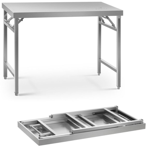 Stół posiada system składania sprężynowego - w szybki i łatwy sposób można go złożyć i transportować. Został wykonany ze stali nierdzewnej co jest gwarancją trwałości i stabilności w trakcie pracy. Jest odporny na korozję, uporczywe zabrudzenia i uszkodzenia mechaniczne. Nie wchodzi w reakcje z żywnością, jest bezpieczny dla zdrowia. Blat o wymiarach 120x70 cm zapewnia dużo miejsca a wysokość 85 cm daje komfort użytkowania. Dzięki regulowanym nóżkom wysokość stołu można zmienić w zakresie +/- 10mm. Udźwig stołu wynosi 215 kg.