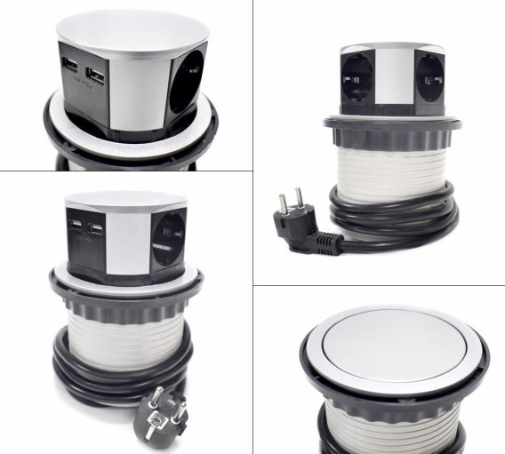 Świetnie nadaje się do użytku w kuchni, wystarczy wmontować gniazdo do blatu szafki kuchennej. Świetny kompan w momencie kiedy używasz kilku różnych elektronicznych przyrządów. Nasze gniazdo ma aż 3 wtyczki sieciowe, do tego aż dwa wejścia na USB. Do gniazdka możesz podłączyć urządzenia o zasilaniu maksymalnym 3680W.