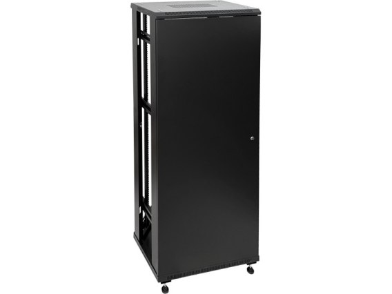 Szafa teletechniczna RACK, stojąca, 19", do stosowania wewnątrzbudynkowego przeznaczona do montażu elementów pasywnych i aktywnych okablowania strukturalnego, zasilania awaryjnego oraz CCTV. Drzwi przednie wyposażone są w zamek zapobiegający dostępowi przez osoby niepowołane. Osłony boczne posiadają zatrzaski ułatwiające ich demontaż oraz zamek. Elementy szafy są malowane proszkowo. Możliwość zamontowania cokołu lub kółek jezdnych - opcja.