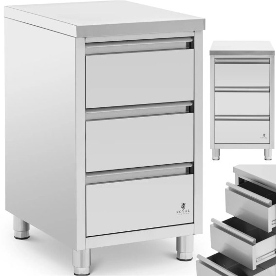 Kod producenta: 10013175 Szafka ze stali nierdzewnej marki Royal Catering pozwala przechować sprzęt kuchenny lub składniki w zasięgu ręki. Wolnostojąca szafka robocza zachwyca kompaktowymi wymiarami i wysoką funkcjonalnością. Jej wymiary wynoszą 50 x 60 x 87 cm. Regulowane nóżki pozwalają ustawić mebel na każdej powierzchni. Trzy płynnie działające szuflady oferują dużo miejsca do przechowywania przyborów lub składników. Duże, zintegrowane uchwyty ułatwiają ich otwieranie i zamykanie. Wszystkie elementy wykonano z wysokiej jakości stali nierdzewnej, przeznaczonej do kontaktu z żywnością. Cechy produktu: