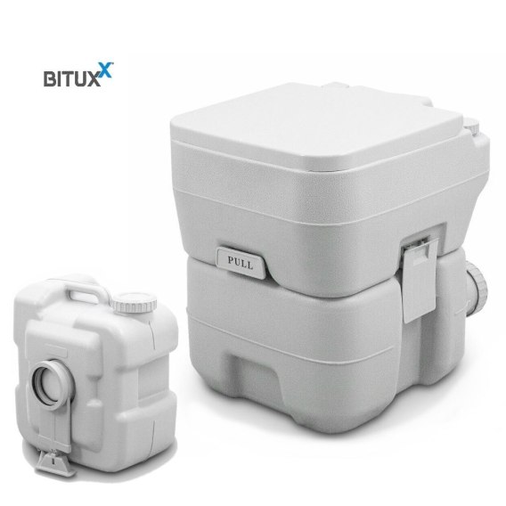 Mobilna toaleta marki Bituxx to wygodne i pojemne WC bez wymagania podłączenia do kanalizacji. Toaleta składa się z dwóch części: na wodę oraz na nieczystości. Te dwie części można w szybki sposób połączyć i rozłączyć za pomocą zaczepów. Toaleta turystyczna wyposażona jest w pompkę do czystej wody ułatwiającą spłukiwanie. Pojemnik na nieczystości jest odłączany i całkowicie szczelny.