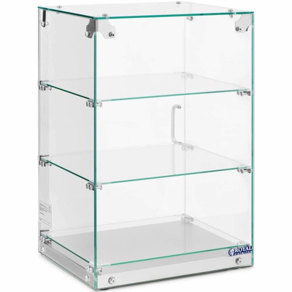 Witryna marki Royal Catering sprawdzi się do prezentacji ciast, deserów czy innych przysmaków w piekarniach, kawiarniach, cukierniach. Pojemność witryny wynosi60 l. 3 poziomy posiadają wymiary 39 x 30 cm. Każda półka pomieści do 12,5 kg ciast, pieczywa czy deserów. Gablota wykonana została ze szkła hartowanego i stali nierdzewnej. Ma elegancki wygląd i jest łatwa w czyszczeniu. Antypoślizgowe nóżki zapewniają jej stabilność i chronią powierzchnię blatu przed zarysowaniem.