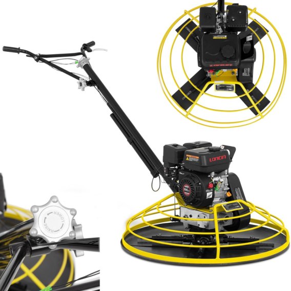Urządzenie posiada silnik o mocy 6,5 KM, który rozpędza łopatki urządzenia o długości 35 cm do prędkości 4370 obr./min. Talerz zacieraczki skutecznie wyeliminuje pozostawienie śladów na betonie. Bezpieczeństwo pracy zostało zagwarantowane poprzez dźwignię odłączającą zapłon oraz klatkę chroniącą łopaty, zwiększającą stabilność oraz redukującą wibracje. Pasek silnika jest całkowicie obudowany. Regulowane uchwyty zwiększają komfort pracy.