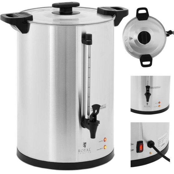 Zaparzacz do kawy marki Royal Catering idealnie nadaje się do produkcji dużych ilości kawy, ale także do parzenia i utrzymywania ciepła herbat lub innych naparów ziołowych. Ekspres o pojemności 20 l i mocy1650 W szybko podgrzewa gorące napoje i utrzymuje je w odpowiedniej temperaturze. Obudowa zaparzacza została wykonana ze stali nierdzewnej, a nienagrzewające się uchwyty pozwalają na bezpieczne przenoszenie urządzenia nawet po zaparzeniu napoju. Pokrywa ze stali posiada mechanizm blokujący, który zapobiega rozlaniu napoju i zapobiega przed jego zanieczyszczeniem. Zintegrowany wskaźnik poziomu wskazuje liczbę filiżanek i ułatwia porcjowanie kawy. Ekspres pozwoli na napełnienie około125 filiżanek za pomocą kranu dozującego, który gwarantuje czystość bez kapania. Taca ociekowa przymocowana do podstawy zaparzacza zapewnia wysoki poziom higieny i łatwe czyszczenie.