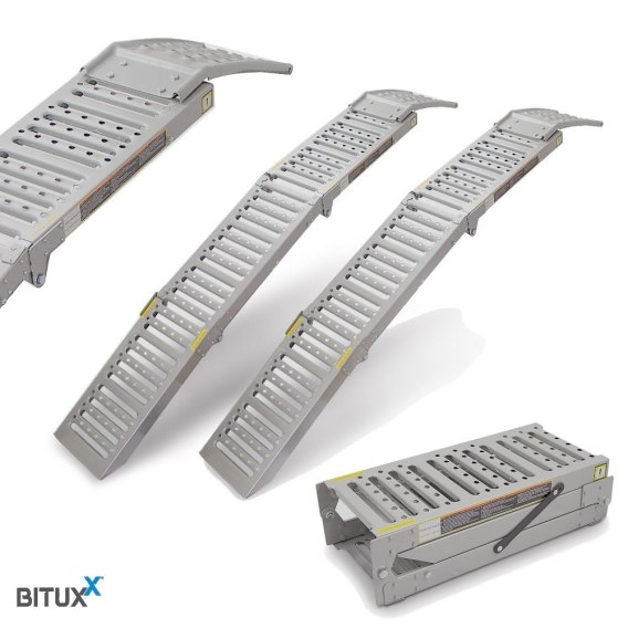 Zestaw ramp najazdowych w formie szyn. Produkt jako rozłożony posiada udźwig do 250kg na jedną rampę, jest idealny do załadunku niewielkich pojazdów takich jak quady, motocykle, kosiarki traktorki.